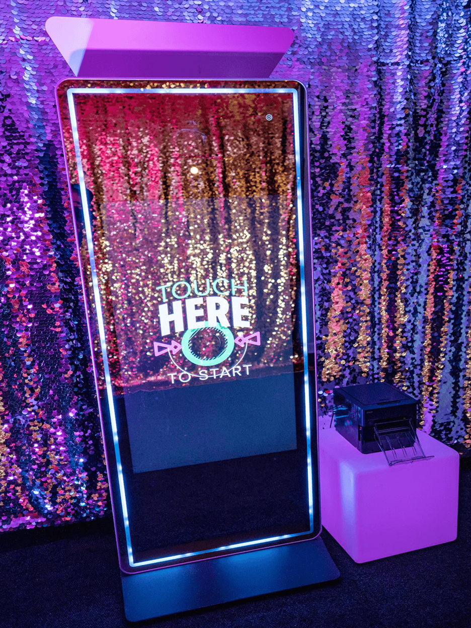 A sleek, interactive mirror experience with animations, luxe props and unlimited prints that turn guests into stars.